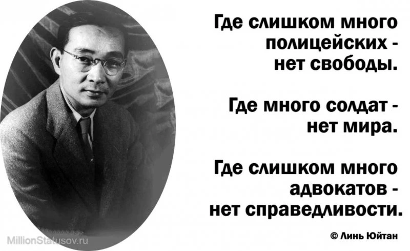 «Человек, который обязан быть в определенном месте ровно в пять часов вечера, заранее испортил себе весь день, от полудня до пяти часов», — Юйтан прославился после выхода книги «Китайцы: моя страна и мой народ», в которой сравнивает родную культуру с европейской. По версии «The New York Times» книга стала одним из главных бестселлеров.