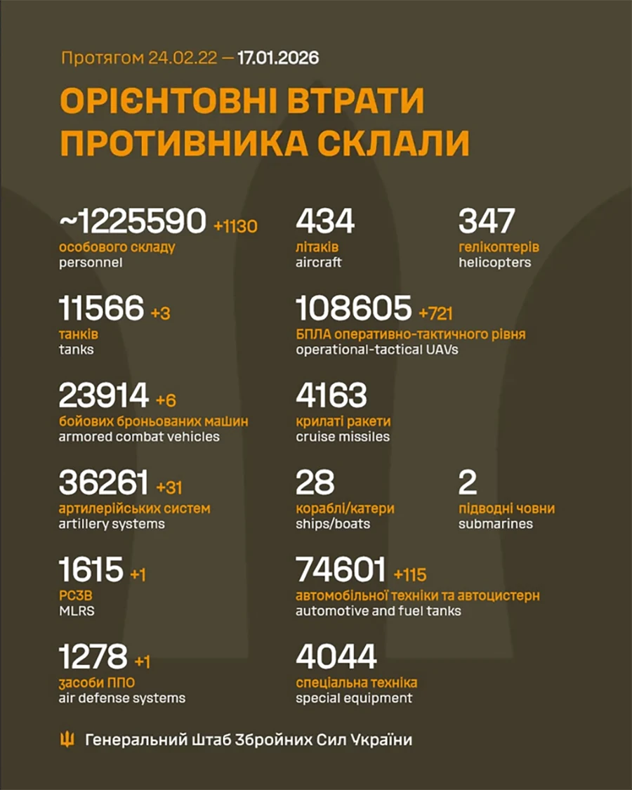Война, 17 января. Киев получает лишь половину необходимой электроэнергии. Белый дом думает над созданием «Совета мира» для Украины