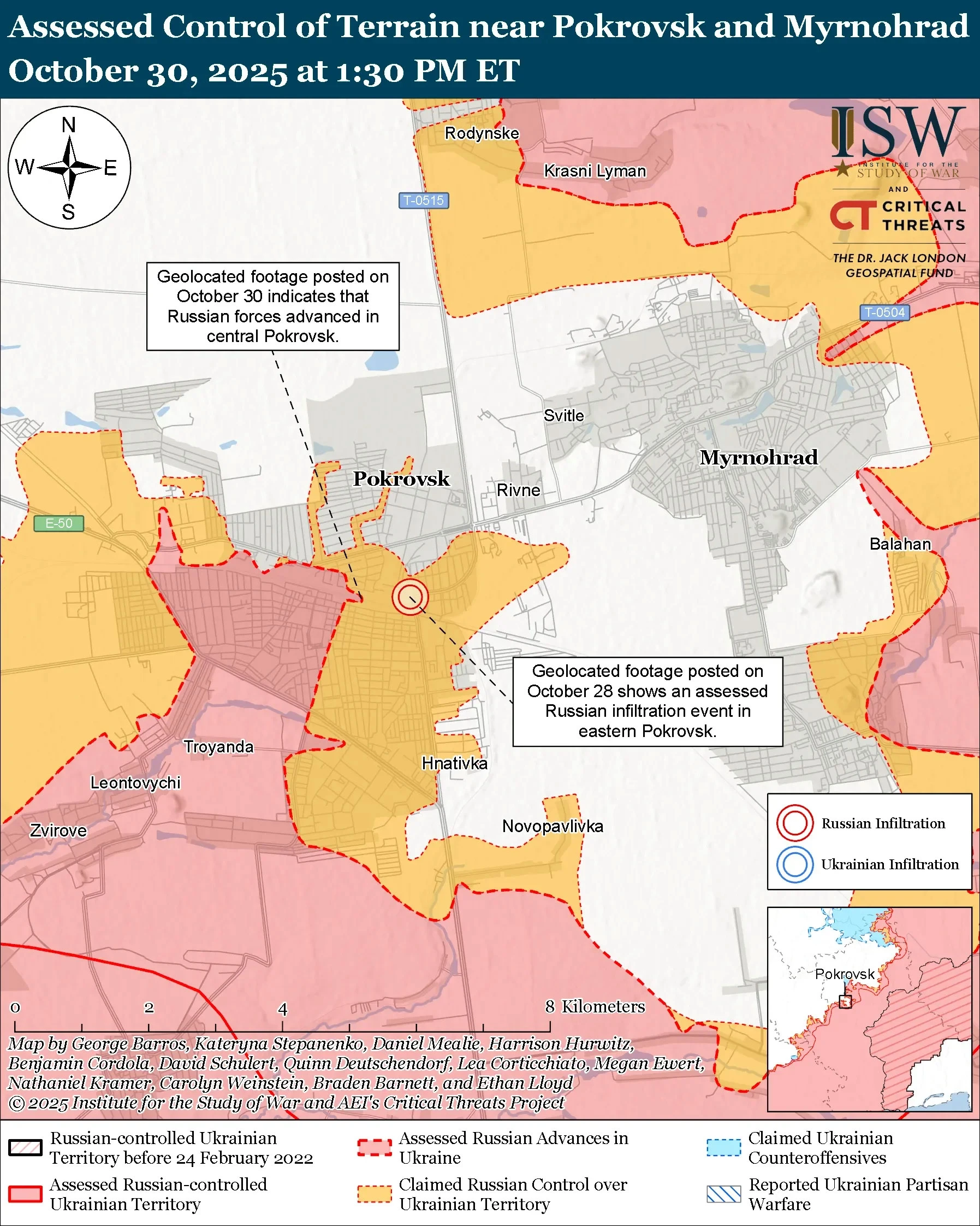 Аналитики Института отметили, что солдаты и командиры украинских подразделений, действующих на Покровском направлении, продолжали указывать на то, что инфильтрационные миссии россиян и их попытки накапливать силы затрудняют наступательные и оборонительные операции украинцев, а также контроль над передвижением россиян в пределах «кармана» под Покровском.